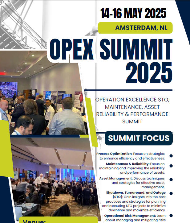 The OPEX 11th Annual Global STO, Maintenance and Asset Integrity Summit is set to take place in September 2025. This premier event brings together industry leaders, experts, and practitioners in the fields of Shutdown, Turnaround, and Outage (STO), maintenance, and asset integrity. Participants will have the opportunity to engage in comprehensive discussions, workshops, and presentations focused on the latest best practices, innovations, and strategies to enhance operational efficiency and asset management. Key topics will include effective STO planning, advanced maintenance techniques, and ensuring asset integrity to minimize downtime and maximize performance. Attendees will also have the chance to network with peers, explore cutting-edge technologies, and gain valuable insights from leading professionals in the industry. Join us for this essential summit to stay ahead in the industry and drive excellence in your organization.